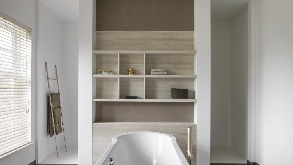 Een badkamerrenovatie van ongeëvenaarde klasse, waarbij we ook een dressing hebben geïntegreerd. Met een meesterlijke combinatie van hoogwaardige materialen zoals corian en lariks, en sanitair van CEA design, hebben we een oase van elegantie gecreëerd. Laat u inspireren door het tijdloze design en de verfijnde afwerking die onze vakmanschap kan bieden.
